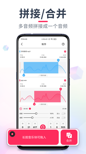 2、轻松添加不同风格的音效,将音乐变得更加丰富,根据需要自由拼接并制作成音乐作品。